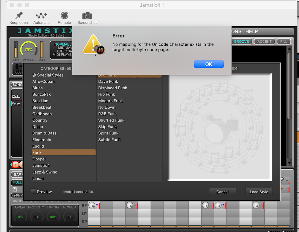 I get a unicode "No Mapping" error when I select the Funk/6-8 Funk Style.