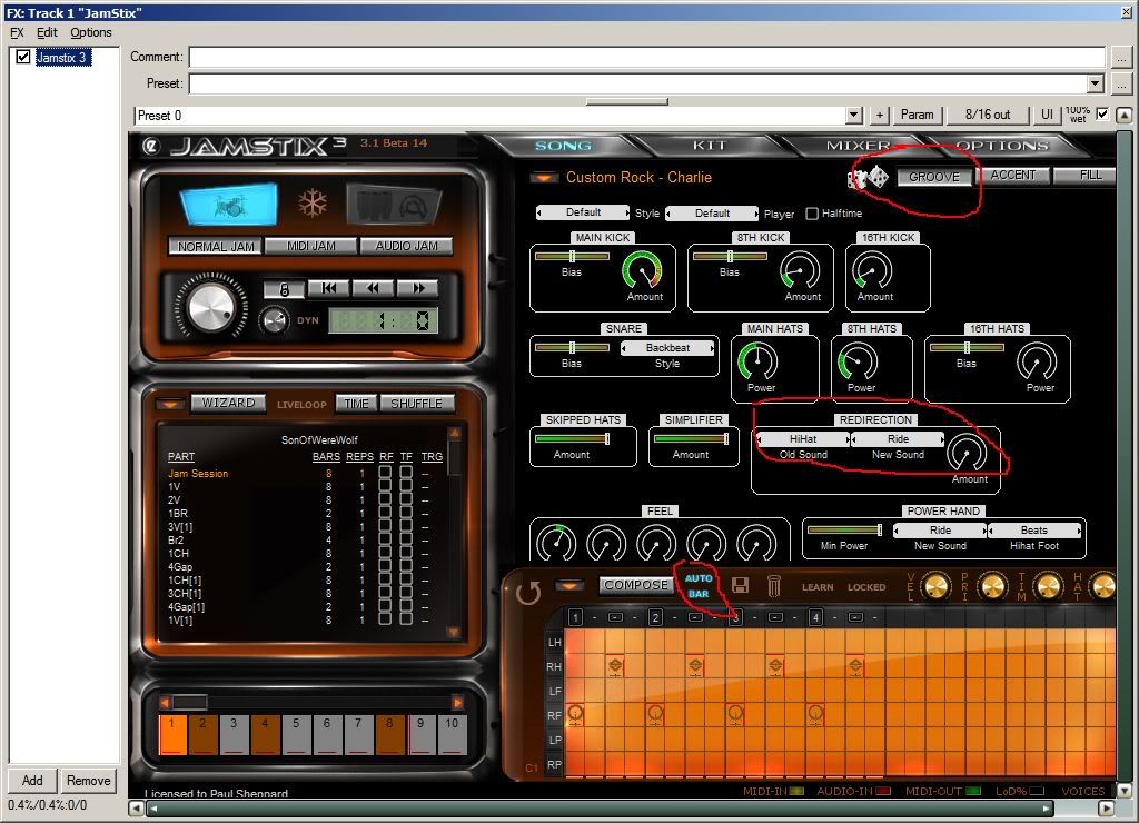 | Many styles will automatically switch to the ride if you the Power up to around 85/90, just as a real drummer tends to switch when playing harder. If you use your DAW to automate Jamstix's Power envelope for that section, your hats will move to the ride and the other drums will be played with a little more "oomph" to go with it. |